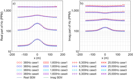 EM responses obtained from 4 cases of Example 2 compared to SEM results: (a) real part; (b) imaginary part.
