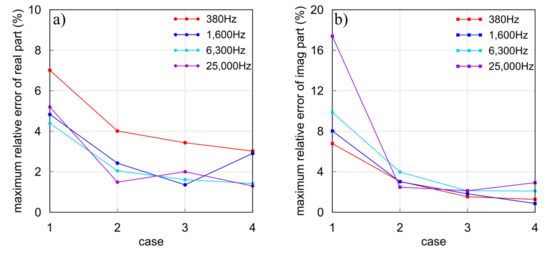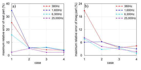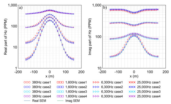 In this section, we first assume a synthetic Example 1 with a 1 ohm-m conductive body embedded in a 100 ohm-m half-space for our modeling. The size of the conductive body is 80 m × 80 m × 20 m with a top depth of 40 m. The coordinate of its central point is (0 m, 0 m, 50 m). The system parameters are the same as the previous models. We calculate the HCP system responses for a total of 31 Tx-Rx locations along the survey line y = 0 m ranging from x = −150 m to 150 m. The transmitting frequencies are 380, 1600, 6300, and 25,000 Hz, respectively. To illustrate the influence of the BSWI scale and mesh size on the accuracy, we adopt four different subdivisions to discretize the model domain. We use BSWI21 elements to divide the model into mesh for Case 1 and 2, while we use BSWI22 elements to divide the model for Case 3 and 4. In Case 1, the maximum size of 40 m × 40 m × 40 m is assumed. In Case 2, a mesh refinement is applied to the model without changing the scale of BSWI basis. In Case 3, the scale is increased to j = 2 while the mesh is still the same as in Case 1. In Case 4, the mesh is refined, and the scale is increased. The EM responses are shown in Figure 10, respectively, while the time consumptions are given in Table 3. For easy comparison, we also present the EM responses calculated by the spectral element method (SEM). According to [63], as a high-order numerical algorithm, SEM has proved to be very accurate. Here, we use the third order of Gauss–Lobatto–Chebyshev (GLC) polynomials as the basis function of SEM for the mesh size of 20 m × 20 m × 20 m. It is seen from Figure 10 that the model in Case 1 failed to obtain reasonable results, as a large difference between Case 1 and SEM can be observed. Table 3 shows the maximum relative errors between our results and the SEM solutions for four cases. It is seen that the maximum relative error between these two methods is 17.4% at 25,000 Hz. This means that the results in Case 1 are not reliable. Meanwhile, the response at high frequencies shows a dramatic oscillation. This is because as the frequency increases, the EM field varies quickly, so that it becomes harder for a rough mesh to simulate. To improve the accuracy, we apply in Case 2 a mesh refinement. Apparently, the results of Case 2 become smoother and closer to the SEM responses, and the relative error drops at all frequencies with a maximum of 4.01%. Similar results can be observed in Case 3, where we enhance the scale of the basis function on the bases of Case 1. Using BSWI22 elements, the relative error falls down when compared to Case 1 and 2 except for the real part of 25,000 Hz (see Figure 11). Among all frequencies, the maximum relative error is 3.43%. Finally, we apply both the mesh refinement and scale enhancement to Case 1. It is seen that the accuracy is largely improved. The maximum relative error between Case 4 and SEM falls to 3.02%. This confirms again that in our new algorithm, we can improve the modeling accuracy by mesh refinement and the scale enhancement.