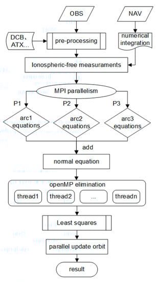 The parallel approach proposed for the ultra-rapid orbit determination of the double-differenced network solution mainly adopts the MPI/OpenMP hybrid parallel programming model. The optimized orbit determination process is shown in Figure 1. After reading observation files, navigation ephemeris files, and some auxiliary model correction files, data preprocessing includes gross error detection, basic model correction, forming double-differenced baseline, and floating solution. Then, the entire time period to be calculated is divided into n segments, and multiple processes are developed based on MPI to read and construct sub-normal equations in parallel. Each process read from the first epoch to the last epoch of the current period so that the consistency of the current arc parameter sequence can be maintained. The above multiple sub-normal equations are accumulated to obtain the total normal equation. Next, in order to further improve the efficiency of orbit determination, the OpenMP multithreading model is used for the parameter elimination process. Finally, after obtaining the precise dynamic parameters by the LS estimation, the same multi-thread model is used to realize the parallel orbit integration to obtain the final satellite POD results. The entire parallel optimization does not destroy the correlation between the parameters without the ambiguity segmentation problem. The input and output of orbit determination do not need to be adjusted greatly, which is easy to implement. It can be applied to single satellite POD as well as multi-GNSS POD.