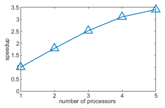 In order to further reflect the improvement of efficiency by the parallel POD approach, the influence of the number of processes on efficiency is analyzed. Multi-process is mainly used to construct normal equations in parallel. All schemes use the same number of threads, the same processing strategy, and select the number of processes as the only control variable to analyze the effect of increasing the number of processes on the computational time. The time consumption is shown in Table 6, and the speedup is shown in Figure 5.
