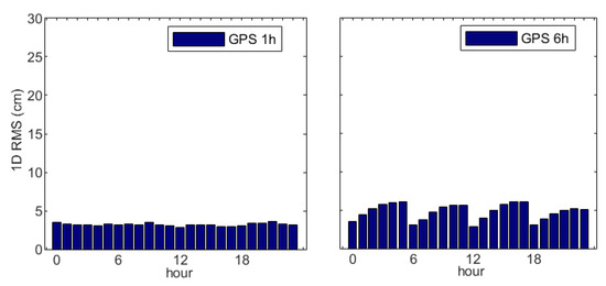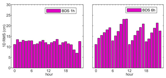 From Figure 7, Figure 8, Figure 9 and Figure 10, it can be seen that the accuracy of the predicted orbit of the 6-h update frequency fluctuates at different extrapolation times. The accuracies of orbit at 0 o’clock, 6 o’clock, 12 o’clock and 18 o’clock are the highest, and then gradually decrease. After the update frequency is increased to 1-h by parallel approach, the accuracy of predicted orbit is higher and more stable at different extrapolation time. The statistical results of the accuracy of GPS/GLONASS/Galileo/BDS orbit are shown in Table 7. Selecting the precise orbit of IGS and CODE analysis center as reference, the along, normal, radial and 1D mean RMS values of predicted orbit of 1-h update frequency and 6-h update frequency are compared.