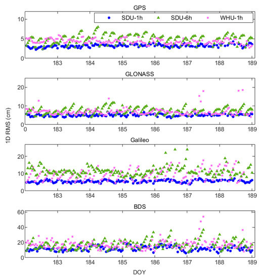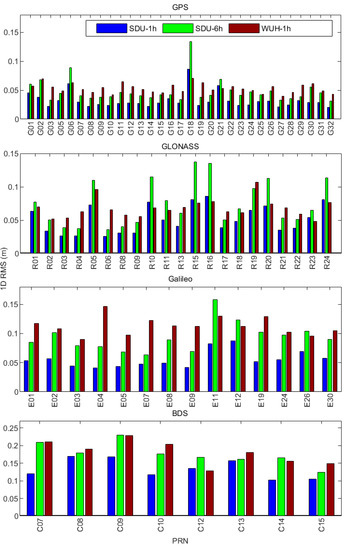 In order to further analyze the performance of the parallel approach, the accuracy of the ultra-rapid predicted orbit is evaluated. The GPS/GLONASS precise orbit of IGS and the Galileo/BDS precise orbit of CODE are selected as reference values. The experiment includes three groups. The first one uses the proposed parallel POD approach with a 1-h updated result (denoted as SDU-1h). The second one uses the non-parallel POD approach with a 6-h updated result (denoted as SDU-6h), and the third one is the 1-h updated result of Wuhan University analysis center (denoted as WHU-1h). The statistical results of accuracy are shown in Figure 11.