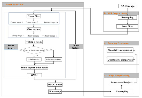 An overview of the proposed approach is presented in Figure 1. It is primarily divided into the following four parts: image preprocessing, water extraction, image postprocessing, and accuracy assessment. In the image preprocessing part, it includes image resampling and a Frost filter. The purpose of resampling is to fasten the running speed of the proposed framework while making the water feature more concentrated, and the Frost filter is used to suppress the speckle noise. In the second part, we employ the Gabor filter to analyze the texture characteristics of the water body and the proposed DTGC algorithm to acquire the whole water area. In the third step, when the water body extraction is completed initially, performing upsampling to restore the original image size; at the same time, some isolated, small non-water targets are corrected or removed through postprocessing. Finally, we qualitatively and quantitatively compare the accuracy of all methods by using different test data to validate the effectiveness and universality of the DTGC model.