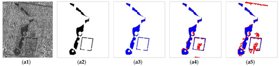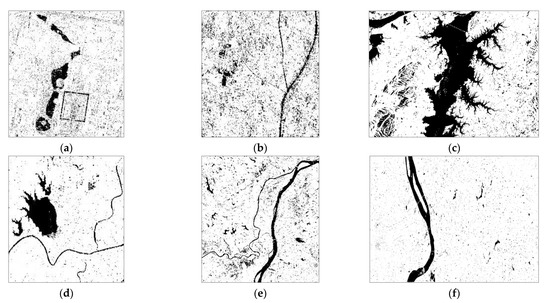 Next, Figure 5 exactly reveals the initial segmentation results acquired by a voting strategy over all data, which are responsible for providing more accurate parameters for the subsequent GMM. In observing Figure 5a, compared with the map of scale 2, even though the noise has increased, it does not affect the recognition for the basic outline of the water body. Therefore, the voting strategy has been also applied to other data.