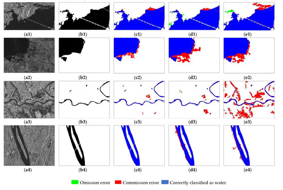 The urban water is not obviously visible in the SAR image due to dense urban buildings, etc.; therefore, it becomes difficult to identify any significant water pixels only by pixel-based processing. Although our method can refine the boundaries as well as suppressing noise to a certain extent, it still has the omission and commission error.