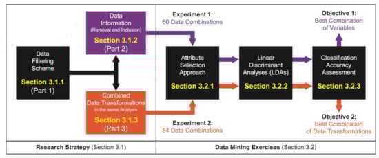 - Disadvantages: LDA outcomes tend to support good classification decisions, but there are limitations. The number of variables must not exceed the number of samples [74]. LDAs are restricted to linearly separable groups. In addition, the variables used should have as small a correlation as possible [75]. This was accomplished through the pre-selection of attributes. Another aspect to consider is that the dataset must include a binary labeling that can be used to assess the LDA performance [76]: the accuracies of our supervised learning method were verified against the baseline of the experts’ classifications.