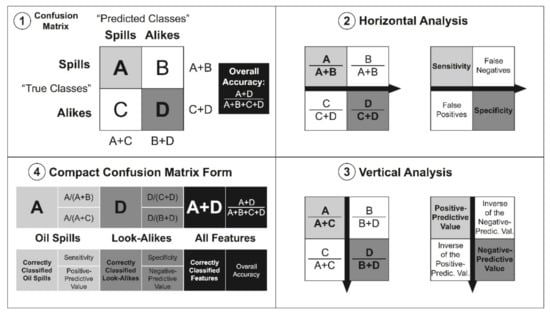 - Panel 3: Vertical analysis gives the positive- and negative-predictive values (the user’s accuracy) and their counterparts (inverse of the positive- and inverse of negative-predictive values: Type II error or commission error).