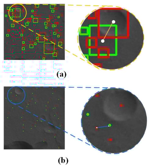 DPCDN is a one-stage, anchor-free target detection network, and its output is a bounding box circumscribed by the crater. Compared with the nearest neighbor matching using the center point, using bounding boxes can improve the matching accuracy. In the case of dense craters, the distance between the center points is more likely to be mismatched. Figure 2 shows this result intuitively.