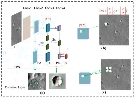 Inspired by the idea of using a convolutional neural network to detect craters [18], a dense point crater detection network (DPCDN) was designed. The architecture of the proposed network is shown in Figure 3. The crater detection algorithm used for navigation should be efficient and robust. A fast feature-extraction layer (FEL) was designed as the backbone. In the anchor point design, each position of the low-level feature map (P2) is associated with multiple anchor points to detect dense small-scale craters.