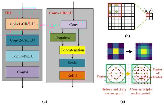 (a) Structure of FEL and Conv-CReLU. (b) Relationship between point (x,y) of feature map and point of original map. (c) Changes in centrality before and after dense anchor points.