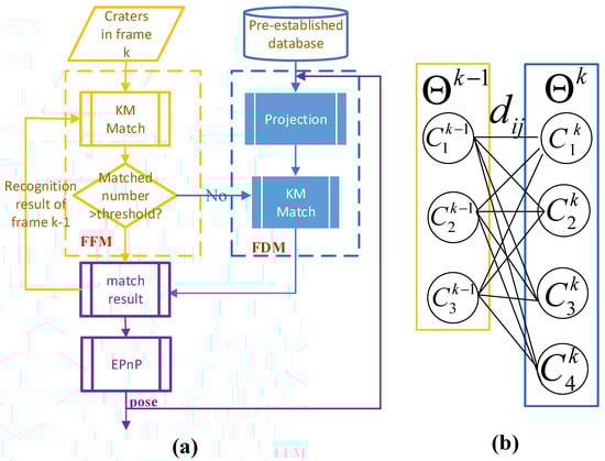 (a) Recognition workflow. (b) KM matching algorithm where the is the distance between craters, including the feature distance and IOU distance. is for the craters and is the ith crater in the kth frame.