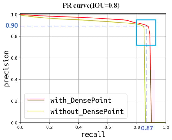 The design of dense anchor points effectively improves the detection of dense, small craters, which is why DPCDN is better than other methods, and it also improves detection precision. The above experiment uses F1 score when IOU = 0.5 for evaluation. However, IOU = 0.5 has the problem of insufficient accuracy in relative terrain navigation based on the crater. IOU indicates how close the detection bounding box is to the ground truth. Average Precision (AP) value is used to evaluate the performance of using the dense anchor points. The AP value is the area enclosed by the precision-recall curve (PR curve) and the horizontal axis of the coordinate axis under a certain threshold. Figure 10 shows the PR curve with and without dense anchor points when IOU = 0.8. The interval between the two curves in the blue box represents the difference between the two methods. It can be seen from the figure that, without dense anchor points when the recall rate is 0.87, the accuracy is close to 0, while the accuracy of the network with dense anchor points is still 0.9 at the same recall value. Using the 0.5–0.95 threshold proposed by MSCOCO [35], the mean AP (mAP) value is used as the evaluation method. The mAP of the network without dense anchor points is 0.767, and that of the network with dense anchor points is 0.855. The performance improved by 11.47%.