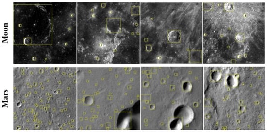 During training, the Bandeira database and images taken by the high-resolution stereo camera (HRSC) in the Express spacecraft were used to form a dataset. There are 9000 images in the training set and 3000 in the test set. The resolution of each image was 600 × 600. The strategies of data augmentation include random rotation, random flips, random shift, and random Gaussian blur.