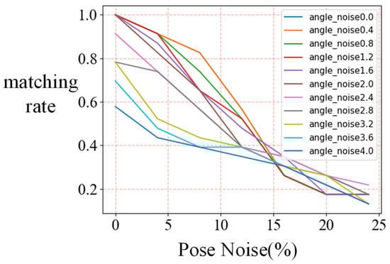 Using bounding boxes instead of points as matching objects improves the success rate of matching and is more robust to noise. Figure 12 compares the matching accuracy of the FDM algorithm under different disturbance levels. The perturbation angle ranges from 0° to 4°, the step length is 0.4°, and the position perturbation ranges from 0% to 25%. The relationship between the matching rate and noise level is shown in Figure 12. In Ref. [3], images are used to show the corresponding results, in which the angle perturbation is 4° and the matching rate is already less than 20%, but the FDM matching rate is 58%. The matching method used in this paper is more robust than that in the literature [3] because using the IOU of bounding boxes and features information improves the matching rate.