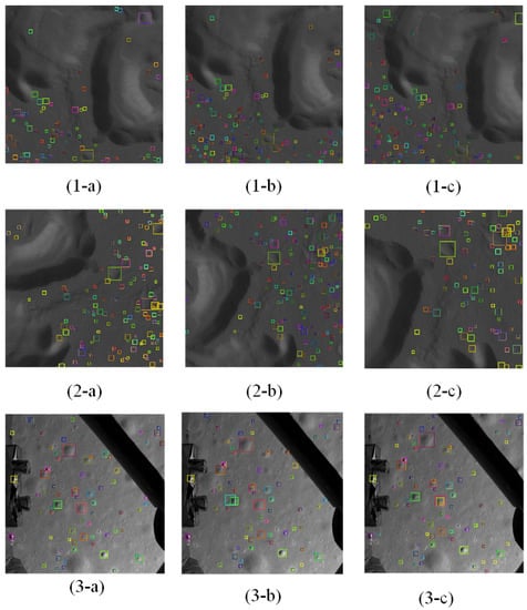 Figure 13 visualizes the matching results between frames, where the images of (1-a)–(2-a) are the experimental sequences discussed in this paper, and the algorithm is applied to the landing sequence of Chang’e 3. The yellow rectangles are the DPCDN detection result, and the rectangles with the same color in different images indicate the same crater.