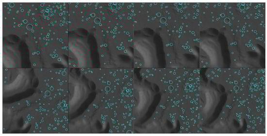 At present, many researchers have studied crater detection methods and established a crater database of the Moon, Mars, and other planets through artificial or automatic detection methods [8,24,25,26,27]; herein, the Bandeira Mars Crater Database is used for experimental data (Figure A1). The Bandeira database contains a length of 40 km 59 km, covering an area of 2360 km2, which is located between Mars −47.66′E/−48.68′E and North latitude 7.28′N/7.95′N. This area contains a huge number of craters. There are a total of 3050 hand-marked craters in the database, with a radius between 20 and 5000 m. This dataset has been used in many studies to facilitate the comparison of method performance [17].