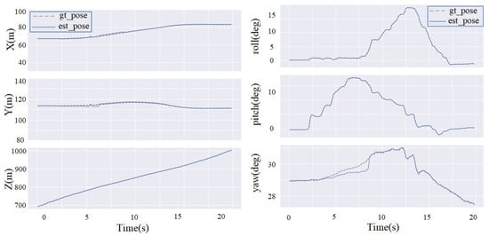 Ground-truth vs. estimate trajectories. The subfigures from the upper left to the lower right represent the estimated and ground truth trajectories of x, y, z direction, and rolling, pitch, and yaw, respectively. Dashed lines represent ground truth trajectories, and solid lines represent estimated trajectories.