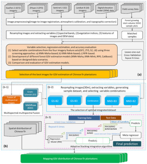 The research framework for forest GSV estimation based on adaptive-Stacking algorithm. (a) Selection of the most suitable image for GSV estimation; (b) (b-1) Multispectral image fusion, (b-2) selection of optimal integrated dataset, (b-3) flow chart of adaptive stacking ensemble algorithm.