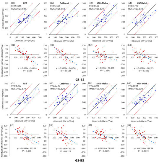 Scatter plot and residual distribution of the predicted GSV results obtained by the RFR, CatBoost, KNN-Maha, and KNN-Mink modeling algorithms under the fused images of GS-B2 (a1–b4) and GS-B3 (c1–d4) dataset scenarios. The blue dotted line is the fitting trend of the sixth-order polynomial between the estimated value and the observed value of GSV.
