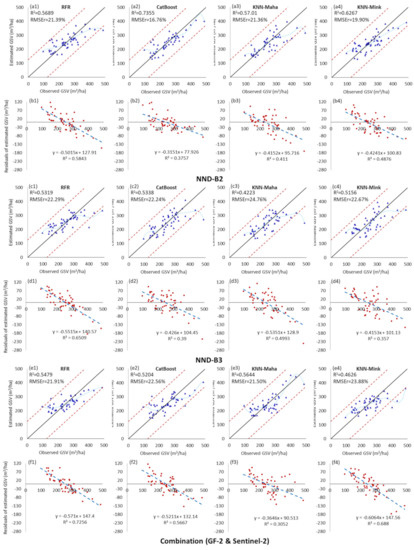 Scatter plot and residual distribution of the predicted GSV results obtained by the RFR, CatBoost, KNN-Maha, and KNN-Mink modeling algorithms under the fused images of NND-B2 (a1–b4) and NND-B3 (c1–d4), and the combined (e1–f4) of GF-2 & Sentinel-2 dataset scenarios. The blue dotted line is the fitting trend of the sixth-order polynomial between the estimated value and the observed value of GSV.