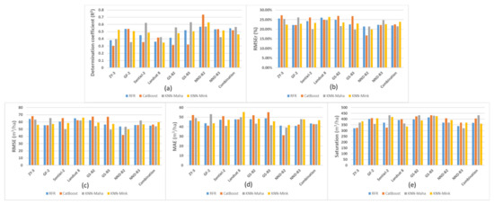 Comparison of various evaluation indexes of GSV estimation results based on nine dataset scenarios obtained by RFR, CatBoost, KNN-Maha and KNN-Mink modeling algorithms, respectively. (a–e) are the R2, RMSEr, RMSE, MAE, and Saturation, respectively.