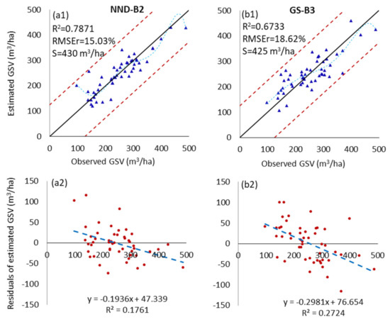 Scatter plots of the observed and estimated GSV values (m3/ha) using the NND-B2 and GS-B3 datasets with feature variables selected by the RFR-based method. (a1,a2), the GSV estimated from the fused image NND-B2 using the AdaStacking model. (b1,b2), the GSV estimated from the fused image GS-B3 using the AdaStacking model.