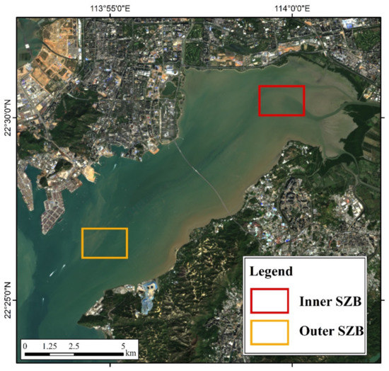 Situated between the Hong Kong Special Administration Region and Shenzhen, Guangdong Province (China), SZB (113°55′8″–114°5′13″E, 22°26′23″–22°30′46″N) is a semi-enclosed shallow bay (see Figure 1 for location). SZB is traversed by a bridge, and it is surrounded by urban land on three sides. The bay receives terrestrial input from rivers such as the Shenzhen River, the Dasha River, and the Shan Pui River. With a coastline of approximately 60 km in length, SZB encompasses an area of approximately 90.8 km2. According to its geographic location, we define the northeast corner near the Shenzhen River and the Shan Pui River as Inner SZB; the southwest corner connected to the open sea is designated Outer SZB. For the analysis, we used a rectangular area of the same size (see Figure 2) to represent Inner SZB and Outer SZB. The water is relatively shallow in Inner SZB (depth generally less than 5 m and averaging 3 m), but it deepens in Outer SZB. In SZB, there are irregular semidiurnal tides with an average tidal range of 1.36 m at the mouth as well as southwest–northeast reversing tidal currents [23,24].