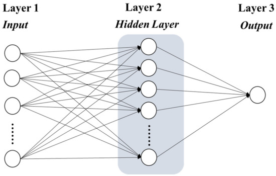 BPNN is one of the most commonly used artificial neural networks, which is based upon the biological neural system in a highly simplified form. These networks provide a statistical tool for simulating the dependent variables of various engineering problems, especially where highly complex relationships define the physical processes of the problem [30]. The simplest three-layer structure of BPNN includes an input layer, hidden layer, and output layer (see Figure 4).