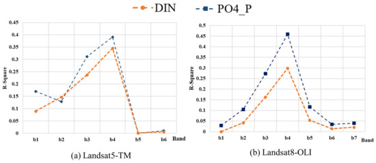Correlations between the radiance values of Landsat single-band data and the in situ CDIN and CPO4_P: (a) Landsat-5 TM; (b) Landsat-8 OLI.