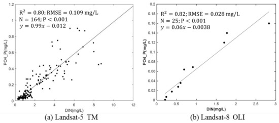 Analysis of the correlations between the in situ CDIN and CPO4_P measurements (units: mg/L): (a) Landsat-5 TM; (b) Landsat-8 OLI.