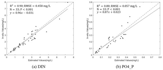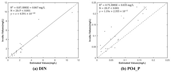 The SVM model was trained on the Landsat-8 OLI data. The visible- and NIR-band Landsat-8 data were selected as the input. Similar to the neural network, the data were divided into a training set (80%) and test set (20%). To avoid overfitting, the data were subjected to a five-fold cross-validation [32]. The obtained CDIN and CPO4_P retrieval models yielded RMSEs of 0.571 and 0.032 and R2 values of 0.66 and 0.80, respectively. Due to the relatively small amount of matched Landsat-8 OLI data, Landsat-8 OLI data for the measurement months were used to form an independent validation set. The validation results are shown in Figure 8.