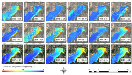- Yu, X.; Yi, H.; Liu, X.; Wang, Y.; Liu, X.; Zhang, H. Remote-sensing estimation of dissolved inorganic nitrogen concentration in the Bohai Sea using band combinations derived from MODIS data. Int. J. Remote Sens. 2016, 37, 327–340. [Google Scholar] [CrossRef]