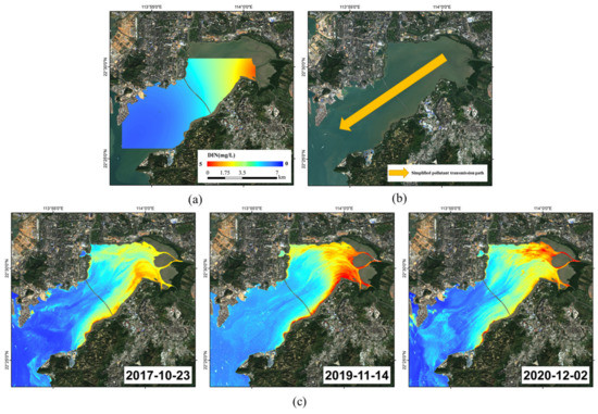 In Figure 9 and Figure 10, the top, middle, and bottom rows of the retrieved images correspond to the pre-2000 period, the period between 2000 and 2010, and the post-2010 period, respectively. The retrieved multi-year nutrient concentrations show specific spatial distribution trends. The nutrient concentrations were higher in Inner SZB than Outer SZB. High concentrations were clustered in the estuary of the Shenzhen River near northeastern SZB, as well as in the areas of SZB near land. The concentrations were lower in central SZB than in the SZB regions near land, mainly because pollutants in SZB originated primarily from the rivers (e.g., the Shenzhen River and Shan Pui River) flowing into Inner SZB [19]. Pollutants produced by human activities flow into the river through surface runoff and underground pipelines. The smaller tributaries flow into the Shenzhen River and the Shan Pui River, and finally into the SZB; this pattern greatly influences the water quality of Inner SZB. To some extent, SZB can be considered an independent system (simplified as a southwest–northeast gulf system) (Figure 11b). The pollution sources are mainly located in the northeast corner and spread to the southwest.