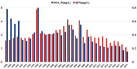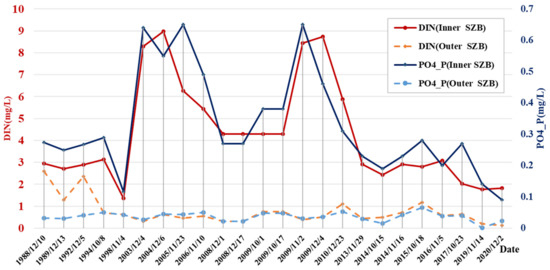 Regression analysis of the changes of CDIN and CPO4_P in Inner SZB and Outer SZB is shown in Table 3. A slope of less than 0 indicates a decrease and vice versa. A greater absolute value of the slope indicates a more significant change. On this basis, it can be seen that changes were more pronounced in Inner SZB than in Outer SZB. In addition, CDIN changed more significantly than CPO4_P in Inner SZB. In contrast, in Outer SZB, the changes of CDIN and CPO4_P were relatively insignificant, with the concentrations remaining nearly the same and CDIN slightly increasing.