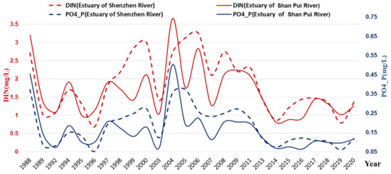 The annual average CDIN and CPO4_P of the Shenzhen River and Shan Pui River estuaries in Figure 13 show that the nutrient concentrations first increased and then decreased; the overall trend was downward. Note the pivot points occurred at different times. The nutrient concentrations in the Shan Pui River decreased between approximately 2005 and 2009. During this period, Hong Kong focused on pollution sources through a voluntary surrender scheme for poultry and pig farming licenses. As a result, the water quality in the Shan Pui River and other surface sources that discharge into the Shenzhen River improved [5,23]. A notable decrease in the nutrient concentrations on the Shenzhen side of the SZB began after 2013. In 2000, the two governments formulated the “Deep Bay SZB Water Pollution Control Joint Implementation Program” (JIP) to improve SZB’s water quality. The JIP outlines pollution-control measures to be undertaken by both governments at various stages to reduce wastewater discharge into Deep Bay by extension and improvement of sewerage infrastructure [5]. Multi-year observations indicate that the work conducted in the Shenzhen River was highly effective and that both CDIN and CPO4_P in the Shenzhen River were declining. Prior to 2013, the diversion of rain and sewage water was relatively unsatisfactory in Shenzhen. As a result, during heavy rainfall events, rain and sewage water would overflow and directly discharge into the rivers that eventually emptied into SZB, resulting in deteriorating water conditions in SZB. With completion of the 12th “Five-Year Plan” and the implementation of the 13th “Five-Year Plan”, a sewage system based on the diversion of rain and sewage water, as well as pollution interception and treatment, has been put into operation to strengthen the comprehensive management of drainage [33]. As a consequence, there has been a decrease in overflow and direct discharge as well as a gradual improvement in the water conditions in the rivers flowing into SZB.