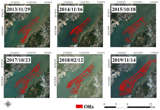 The ORs significantly differ from water bodies in remote-sensing imagery but are spectrally similar to land. Therefore, ORs and water bodies can be differentiated using the NDWI [28]. The ORs identified for each year are shown in Figure 15.
