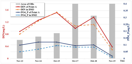 From 2013 to 2019, the general trend is an increase in the area used for ORs. To examine the impact of ORs on water quality, a graph of annual changes in nutrient concentrations at point A (see Figure 16 for location) within the OFA in central SZB was produced (see Figure 17 for results).