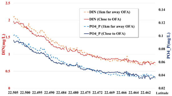 In the graph in Figure 19, the latitude gradually decreases from left to right, corresponding to the direction from Inner SZB to Outer SZB. Based on Figure 10, the nutrient concentrations were significantly reduced from Inner to Outer SZB. The difference between the nutrient concentrations near OFA and 1000 m away is not obvious, but the value does fluctuate. However, as the distance from OFA decreases, the water quality neither improves nor deteriorates. Based on these results, it is not clear whether oyster farming improves the water quality of SZB because oyster farming is not the only influencing factor.