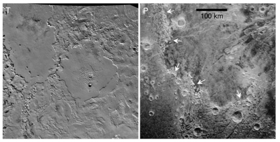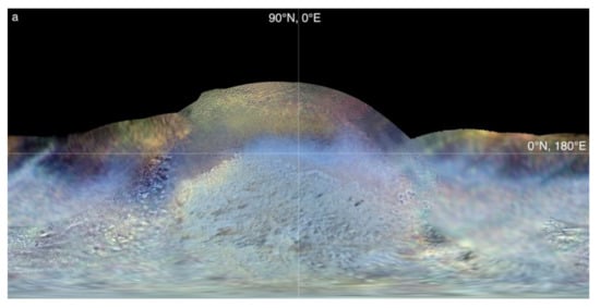 - Singer, K.N.; Schenk, P.M.; McKinnon, W.B.; Beyer, R.A.; Schmitt, B.; White, O.L.; Moore, J.M.; Grundy, W.; Spencer, J.; Stern, S.A.; et al. Large-scale cryovolcanic resurfacing on Pluto. Nat. Commun. 2021. in revision. [Google Scholar]