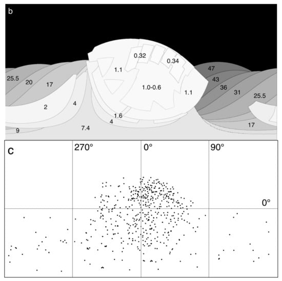 To produce the updated image mosaic of Triton (Figure 1) with the best quality image at each point, and optimal derived topographic map products (see next section), an update of the camera pointing vectors for the Voyager images was required. As described in the Pluto/Charon reports [19,20], we use the USGS-ISIS “jigsaw” bundle adjustment algorithm to update camera pointing vectors for the Triton images simultaneously based on match points linking features in the images. Our effort (Figure 1c) represents an update to the revised map posted online [21] and differs from other recent efforts to update the Triton network [22] in that we include all color images, the two highest resolution wide angle images, the resolved departure crescent images, and all approach images from the final Triton rotation prior to the closest approach.