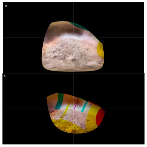 Our results show that PC mapping on Triton (and other icy surfaces) is most reliable on image data acquired within ~30° of the terminator and we limit our mapping to these areas, which cover ~8% of the total surface (Figure 6). These are areas where shading due to slope rather than inherent albedo variations of surface materials is the dominant contributor to the apparent brightness of terrains. Variations in photometric properties of the surface and the lack of a true albedo model for all of Triton at kilometer scales can result in the dominance of albedo-related slope artifacts at incidence angles below ~60°. Our PC implementation depends on the assumption that the intrinsic albedo of the surface is uniform, which is often not the case. We use lower resolution images as improvised albedo models of the surface to improve slope estimates and reduce distortions. Even then local albedo changes can influence the derived topography (see the lengthy discussion in [27]). For Triton, albedo variations in the terminator region appear to be negligible at 600–1200 m scales, but albedo variations can be resolved in some portions of cantaloupe terrains in the closest approach mosaic at ~340 m scales. PC does not work in the southern hemisphere terrains because of frequent local albedo variations and the high solar illumination over most of these terrains.