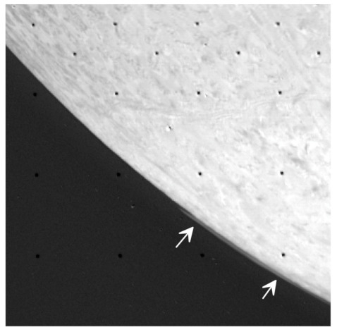 There are characteristics of the Voyager Triton stereo datasets that should be understood prior to interpretation of topographic data derived from these images. The Voyager images were calibrated and registered in the USGS ISIS image processing system using the ISIS-standard processing pipeline for Voyager data (available at USGS online). The key difference between the Voyager optical cameras and CCD and other imagers on later missions (Galileo, Cassini, New Horizons) is that they are vidicon cameras in which the image plate was scanned by an electron beam for readout. To correct for geometric distortion in the image plane, ~220 spots (or “reseaux”) roughly 5 × 5 pixels in size were etched into the plate (Figure 5) and these are mapped out later during image calibration for correction of image distortion. Errors in camera distortion correction resulting from reseaux location errors will result in errors in subsequent geographic placement of pixels on the planet’s surface that will be incorrectly interpreted as real parallax displacements and hence real topographic values.