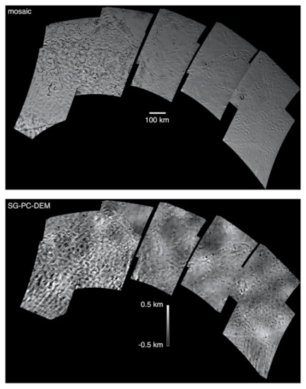 Despite the innovations employed here in using PC on Triton, uncertainties in photometric properties are large enough to make longer-wavelength topographic comparisons (i.e., at scales of circa >100 pixels in the scene) suspect, and they are geologically implausible in most cases. To suppress these distortions and make the topography of smaller features interpretable, a 151 × 151 (~100 km) high-pass filter was run on the final PC DEM, rendering topographic information at these wavelengths and larger invalid in these products.