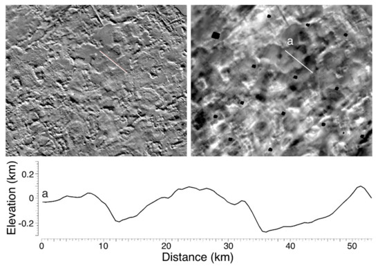 Across most of the VTERM CA mosaic, stereo and low-sun images coincide, allowing us to produce SG and PC DEMs of the same area. In such cases, it is possible to use the SG-based DEM (“SG_DEM”) to control the PC-based DEM (“PC_DEM;” Figure 3 and Figure 6), effectively eliminating the suspect long wavelength information inherent to it. To merge these two types of data, we employ a set of digital filters that suppresses the long-wavelength characteristics of our PC_DEM, while retaining its short-wavelength pixel-scale characteristics. This DEM is then remapped to the SG_DEM, thus combining the high-quality high-frequency information of the PC data with the horizontal control of the stereo data. Of course, small-scale ambiguities in the PC models can also be preserved, such as when small dark spots in the bottoms of craters or troughs are interpreted as shading and create local topographic distortions (e.g., [27]). We have discovered that the merging process tends to suppress these distortions to some degree.