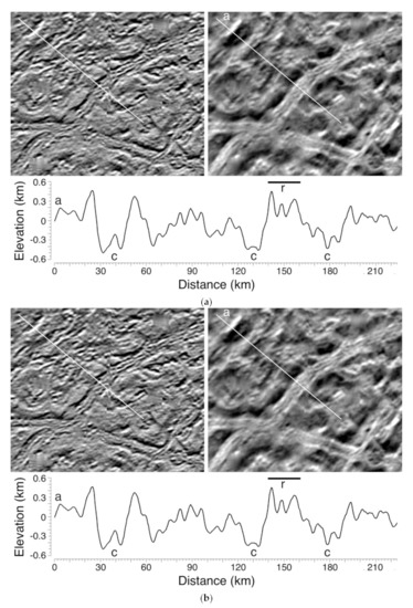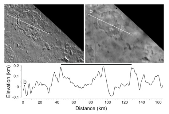 (a)Topographic profile across ridge set (r) and cavi (c) within cantaloupe terrain from SG-PC-DEM in Figure 8. (top) Image mosaic and (right) DEM scene width is ~200 km. (b) Topographic profile across ridge set within eastern cantaloupe terrain. (top) Image mosaic and (right) DEM scene width is ~200 km.