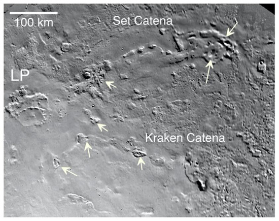 Volcanic plains of Cipango Planum showing spatial association of Leviathan Patera (LP) and Set and Kraken Catena pit chains. Arrows highlight knobs discussed in text. Scene width ~540 km.