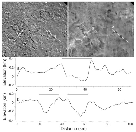 The long curvilinear ridges that cross cantaloupe terrains and southward into the ST (Figure 8 and Figure 12) superficially resemble double ridges observed on Europa and Enceladus in some cases [33] but differ in detail. Rather than consistently maintaining a double ridge morphology as on Europa, the Triton ridges often terminate and bifurcate and can form segments of up to five parallel ridges (Figure 12), suggesting different origins or a more complex evolution or modification. In some cases, the medial ridge is lower than the flanking ridges (Figure 12b). These ridge sets have elevations of up to ~500 m with respect to the floors of cavi depressions that they cut (Figure 12a). Whether these ridges are related to flexural or shear deformation (e.g., [33]), to deposition of material along linear fracturs, or are erosional remnants is not clear. Some of the septa bounding adjacent cavi often appear to merge into the ridges crossing cantaloupe terrain, but beyond these sparse topographic constraints, Triton’s scattered ridges remain enigmatic due to the inability to resolve cross-cutting relationships. A ridge (Figure 8) that crosses into the etched plains to the east (see Section below) is eroded or modified in appearance [6]. This ridge is 250–400 m high, suggesting that the modification process did not remove much mass.