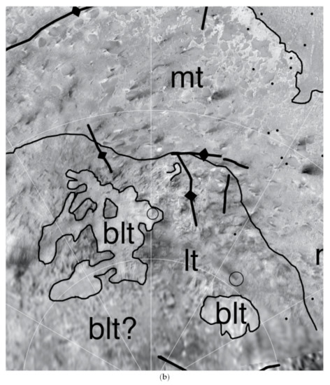 - Robbins, S.J.; Beyer, R.A.; Spencer, J.R.; Grundy, W.M.; White, O.L.; Singer, K.N.; Moore, J.M.; Dalle Ore, C.M.; McKinnon, W.B.; Lisse, C.M.; et al. Geologic Landforms and Chronostratigraphic History of Charon as Revealed by a Hemispheric Geologic Map. J. Geophys. Res. 2019, 124, 155–174. [Google Scholar] [CrossRef]