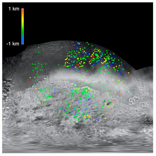 Although spatially limited, two techniques provide supplemental topographic coverage supplemental to the main stereogrammetry and photoclinometry mapping. Five published limb profile tracks [23] covering <0.01% of the surface provide limited topographic insights but lack geologic context as they are located in poorly resolved regions of the global map (Figure 3 and Figure 4). These are derived from analysis of relief viewed in projection along the limb. As such, extreme lows in topography may be hidden by foreground relief and prominent highs (including hazes or clouds) may be seen in projection even when not located on the nominal limb track.
