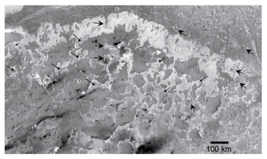 Textures across the planitia include marginally resolved small-scale knobs, depressions, and occasional mesa-like outliers (Figure 13 and Figure 14) that could also be evidence of erosional scarp retreat due to sublimation, or they could be related to emplacement of endogenic materials. The largest pit in the center of Ruach Planitia is almost 10 km wide and ~350 m deep and is surrounded by smaller pits, linear troughs, and scarps <100 m deep (Figure 13). The pits in the northern corner of Tuonela Planitia are more complex, with a low dome centered within an oval depression (Figure 14b). The morphologies of pits within the planitia floors are inconsistent with impact craters, and their centralized location suggests either eruptive vent centers or sublimation of the floor materials initiated near their centers. Pits may be related to the sublimation pitting seen at highest resolution on Pluto and Charon [34,35,36], but we have no constraints on the composition of Triton’s planitia or any volatile that might be causing scarp retreat, if that is the origin of the scarps.